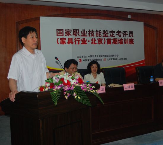 在開班典禮上,中國國家人力資源和社會保障部劉新昌處長針對中國國家職業技能鑒定工作未來的趨勢和發展方向做了精彩的報告,輕工業聯合會孟琪主任針對如何開展家具行業技能鑒定工作做了實際意義的報告,兩位領導的精彩報告博得了在場所有學員的熱烈掌聲。中國家具協會劉金良副理事長針對此次培訓班做了簡短而精煉的發言,代表中國家具協會表示有信心把家具行業的職業資格認證教育發展的越來越好。北京國富縱橫管理咨詢有限公司國際•AST商學院作為中國家具協會的培訓部,中國家具行業職業資格認證教育執行機構為此次培訓班提供精良的會務保障,總裁趙龍博士在開班典禮上風趣幽默的發言,表示北京國富縱橫管理咨詢有限公司一定會把家具行業的職業資格認證教育推向高潮,有信心出色地完成中國家具協會交給北京國富縱橫的任務。